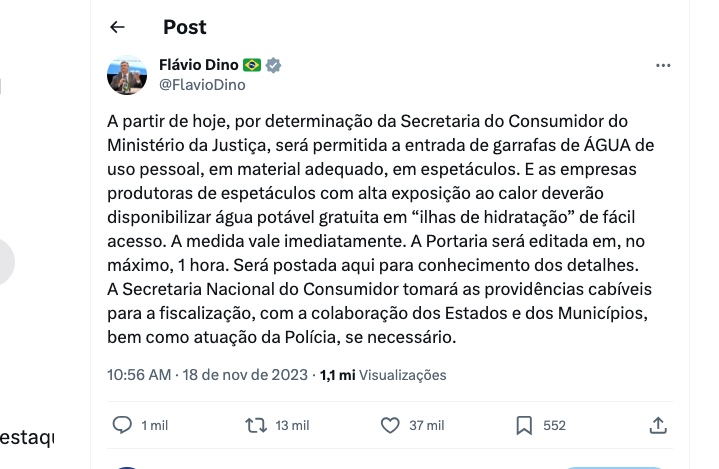"A partir de hoje, por determinação da Secretaria do Consumidor do Ministério da Justiça, será permitida a entrada de garrafas de ÁGUA de uso pessoal, em material adequado, em espetáculos. E as empresas produtoras de espetáculos com alta exposição ao calor deverão disponibilizar água potável gratuita em “ilhas de hidratação” de fácil acesso.", diz a publicação.
