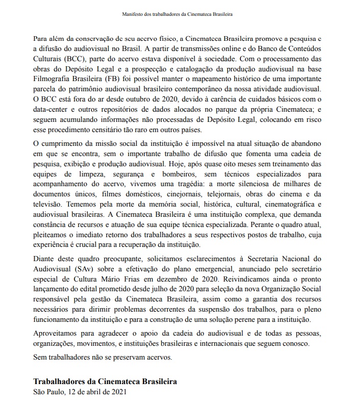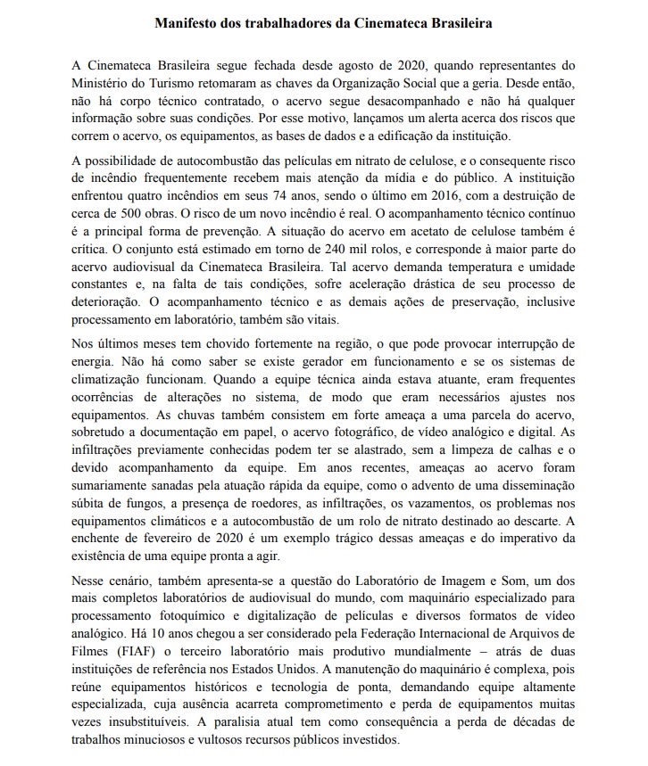 O manifesto afirmava que a "resistência ideológica" seria o único motivo aparente para o governo Bolsonaro não seguir recomendações técnicas de órgãos federais, assumindo a possibilidade de "deterioração do material custodiado pela Cinemateca e do risco crescente de sua destruição”.