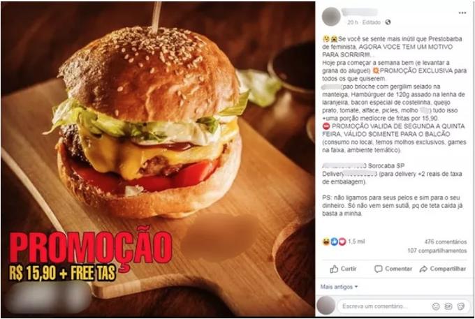 O mesmo estabelecimento já havia causado nas redes sociais com uma postagem que ofendia feministas: "Se você se sente mais inútil que prestobarba de feminista, agora você tem um motivo para sorrir", diz o post.