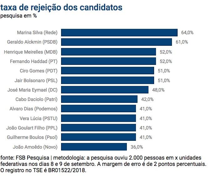 Atrás de Marina Silva, o segundo mais rejeitado é Geraldo Alckmim (PSDB) com 61%, depois vem Henrique Meirelles e Fernando Haddad (PT) ambos com 52%. Jair Bolsonaro (PSL), que lidera a corrida eleitoral, aparece com uma rejeição de 51%. O estudo foi realizado pela FSB Pesquisa, entre os dias 8 e 9 de setembro.