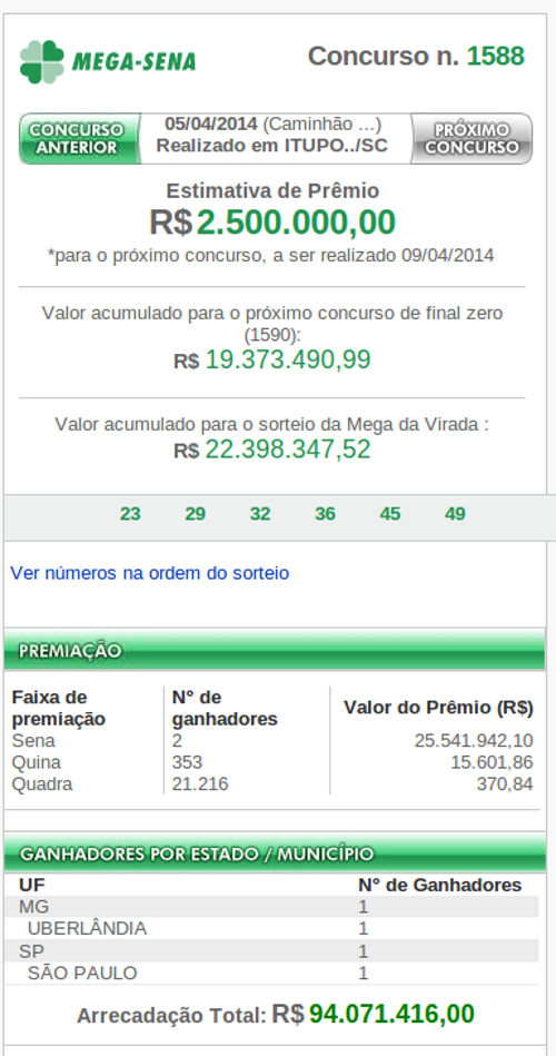 Dois apostadores acertaram as dezenas da Mega-Sena sorteadas neste sábado e vão dividir o prêmio de R$ 50 milhões. Um sortudo é de Uberlândia (MG) e outro de São Paulo (SP). Cada um vai levar R$ 25.541.942,10. O sorteio foi o de número 1.588.