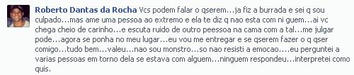 Roberto Dantas Rocha, de 32 anos, suspeito de matar a ex-namorada, Jociely Pinheiro Barbosa, 22, e tentar assassinar o namorado dela, Luciano Gomes da Silva, se defendeu das críticas recebidas na tarde de hoje (13), em seu perfil no Facebook, nos comentários da publicação em que confessa o crime e pede desculpas.