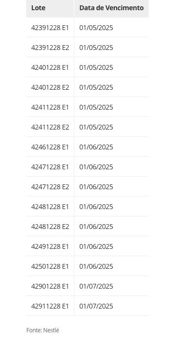 A Nestlé divulgou a lista completa dos lotes afetados, que incluem diferentes datas de vencimento. Os consumidores que possuem algum desses produtos em casa devem entrar em contato com o atendimento ao consumidor da empresa para solicitar a devolução e o reembolso.