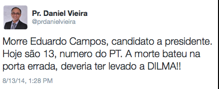 O presidente da Assembleia de Deus em Imperatriz no Maranhão, Pr. Daniel Vieira, teve problemas em sua conta no Twitter nesta quarta-feira (13) após comentário onde dizia que quem deveria ter morrido era a presidente Dilma Rousseff.