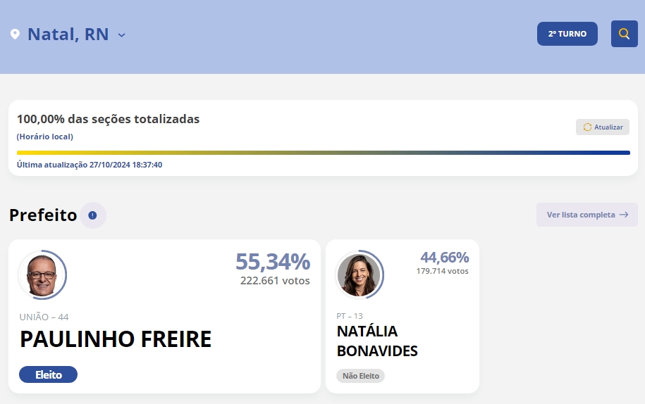 O candidato Paulinho Freire (União Brasil) foi eleito prefeito de Natal neste domingo (27), com 222.661 votos, vencendo a disputa do segundo turno contra a candidata Natália Bonavides (PT), que obteve 179.714 votos.