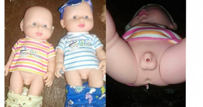 Nos fotos e vídeos que circularam nas redes sociais, os brinquedos têm características femininas, mas possuem órgão genital masculino com muitos detalhes.