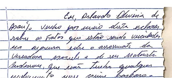“Eu, Orlando Oliveira de Araújo, venho por meio desta esclarecer sobre os fatos que estão sendo veiculados na imprensa sobre o assassinato da vereadora Marielle e de seu motorista Anderson, que não tenho qualquer envolvimento nesse crime bárbaro”, diz a carta.