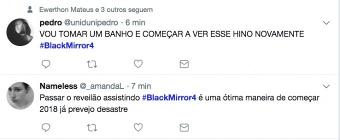 A quarta temporada de Black Mirror já está disponível na Netflix, e em apenas 6 episódios, a produção promete uma reflexão mais bizarra ainda do futuro da humanidade que se torna cada dia mais dependente da tecnologia, com capítulos totalmente diferentes. Nas redes sociais os fãs já fizeram a série virar o assunto mais comentado do dia.