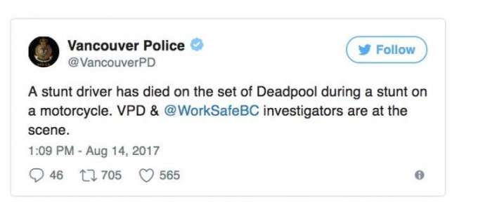 "Motorista dublê morreu no set de Deadpool durante uma acrobacia em cima de uma moto. Departamento de Polícia de Vancouver e investigadores da @WorkSafeBC estão no local do acidente”.