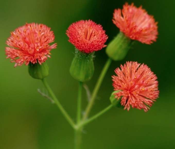 É uma erva espontânea ou "daninha" em cultivos, com flores vermelhas pequenas, em capítulos com "formato de pincel" e não deve ser  confundida com as "serralhas-verdadeiras", plantas semelhantes, mas  maiores, com látex e com flores maiores, amarelas, também com usos medicinais, mas gosto amargo bem forte.