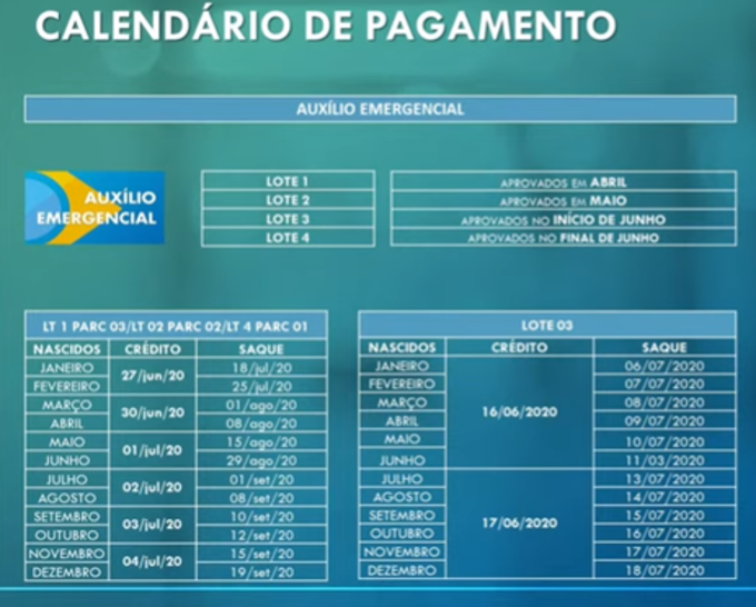 De acordo com a Caixa, os beneficiários do auxílio emergencial estão divididos em quatro lotes. O lote 1 é composto pelas primeiras pessoas que tiveram o cadastro aprovado, no total de 31 milhões, e que receberam a primeira parcela em abril. Essas pessoas já estão começando a receber a terceira parcela. O lote 2 é formado 8,7 milhões de beneficiários que receberam a primeira parcela em maio e estão agora recebendo a segunda parcela. Quem recebeu a primeira parcela do auxílio no início de junho faz parte do lote 3 (5,2 milhões de pessoas), enquanto quem recebeu no final de junho compõe o lote 4 (cera de 1 milhão de pessoas).