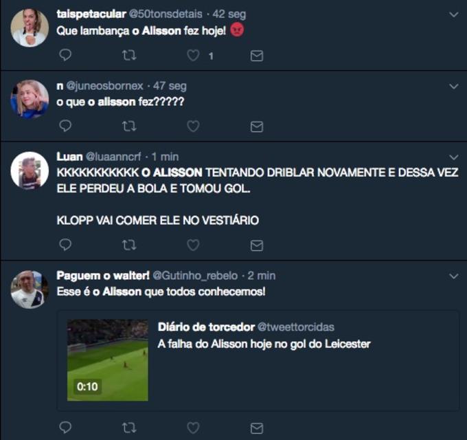 No confronto entre Leicester e Liverpool pelo campeonato inglês neste sábado (1º), o goleiro da seleção brasileira e dos reds falhou ao tentar driblar na defesa, perdeu a bola e deu um gol de bandeja para o Leicester, marcado por Ghezzal, veja o lance bizarro: