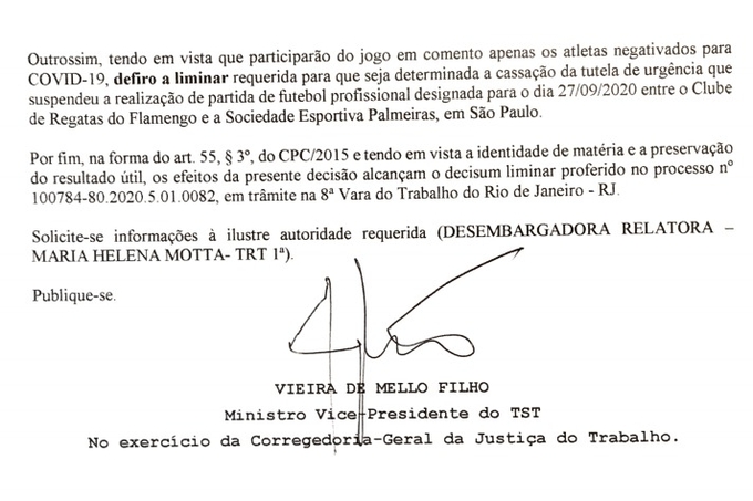O Tribunal Superior do Trabalho acaba de divulgar decisão liberando o jogo entre o Palmeiras e o Flamengo, na tarde deste domingo (27), instantes antes do início da partida.