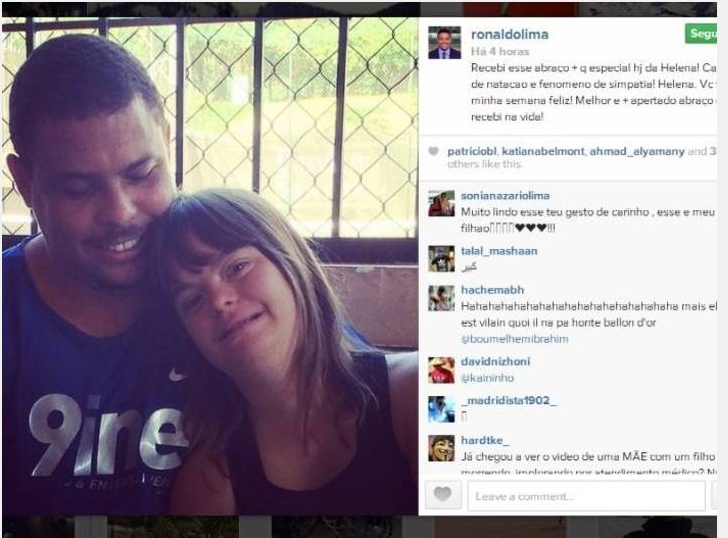 Um dia após responder ao deputado sobre a polêmica envolvendo a doação de ingressos da Copa do Mundo a deficientes físicos, o Fenômeno postou uma foto com uma menina portadora de Síndrome de Down.