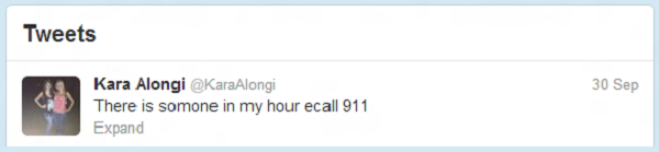 “Tem alguém na minha casa, liguem para a emergência”. Foi com esta publicação em seu perfil no Twitter que a jovem Kara Alongi, de 16 anos, “se despediu dos amigos” e, desde então, não apareceu mais. A adolescente foi supostamente sequestrada e sumiu após a mensagem viralizar na Internet. No entanto, depois de compartilhamentos no microblog e no Facebook, não se sabe ao certo se o caso foi mesmo real ou se não passou de uma armação. O fato é que Kara segue desaparecida.