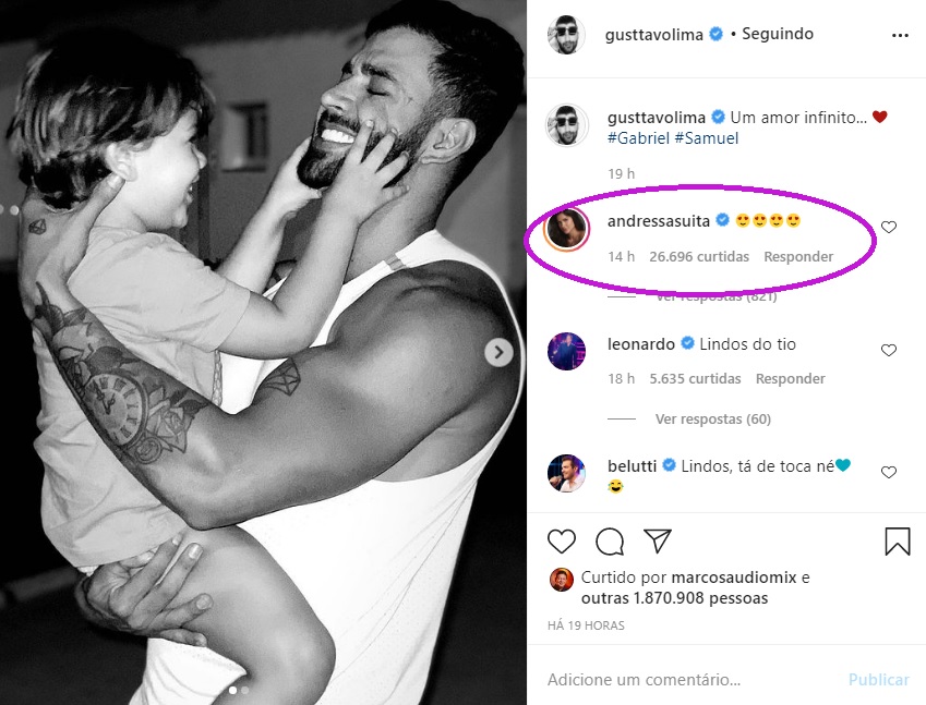 Nesta semana, Gusttavo deixou um comentário de emojis apaixonados na foto publicada pela mãe dos seus filhos. A imagem mostrava Andressa com os herdeiros do sertanejo.