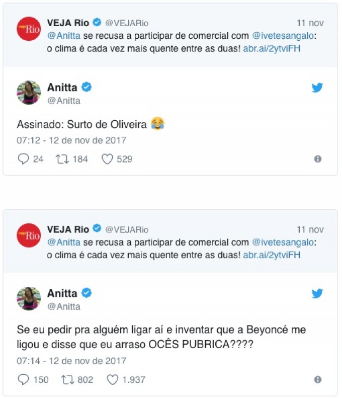 Sobre o caso, Anitta ironizou dizendo "Se eu pedir pra alguém ligar aí e inventar que a Beyoncé me ligou e disse que eu arraso 'ocês pubrica’?”, afirmando que tudo não passa de uma mentira.