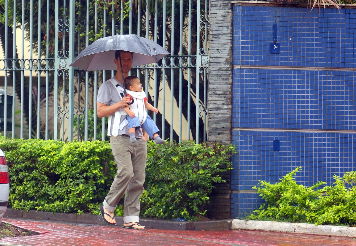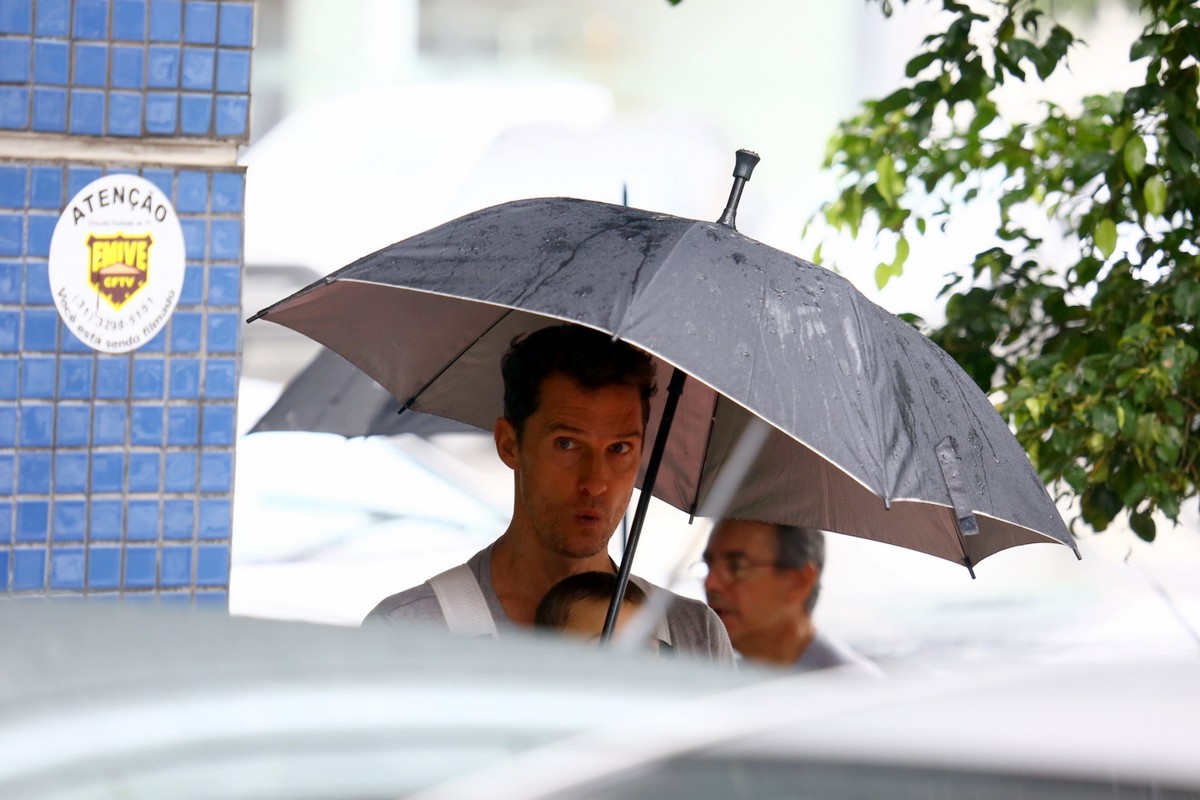 O paizão foi flagrado cheio de carinho e cuidado com o caçula da prole em um passeio matinal à pé pela capital. Segurando um guarda-chuva em uma das mãos e com um canguru preso nas costas, ele deixou o menino em posição frontal para poder observar todo o passeio. Esperto, Livingston apontava as coisas e até percebeu o fotógrafo, coisa que o pai havia visto. Matthew ainda aproveitou para tomar um açaí em um restaurante que oferecia café da manhã.