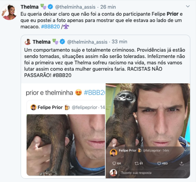 Thelma do BBB20 foi alvo de racismo, nesta sexta-feira (28), após um perfil no Twitter chamá-la de macaco em uma foto onde Felipe Prior segura o animal em forma de objeto.