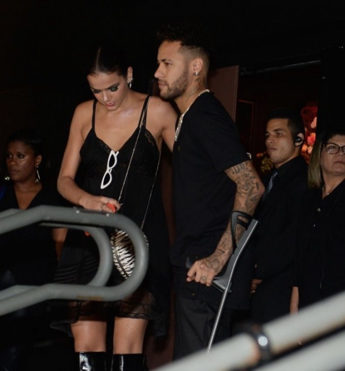 De muleta, Neymar recebeu o suporte da namorada e os dois passaram a noite juntinhos no canto do palco.