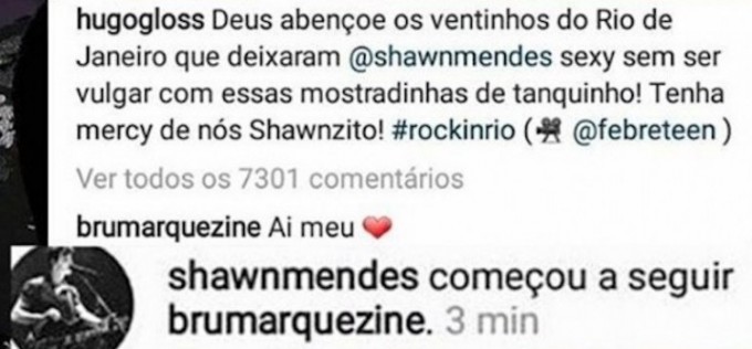 Isso porque Bruna comentou em um vídeo da apresentação de Shawn no Rock in Rio, publicado por Hugo Gloss, que dizia: "Deus abençoe os ventinhos do Rio de Janeiro que deixaram o Shawn Mendes sexy sem ser vulgar com essas mostradinhas de tanquinho! Tenha mercy [piedade] de nós Shawnzito!".