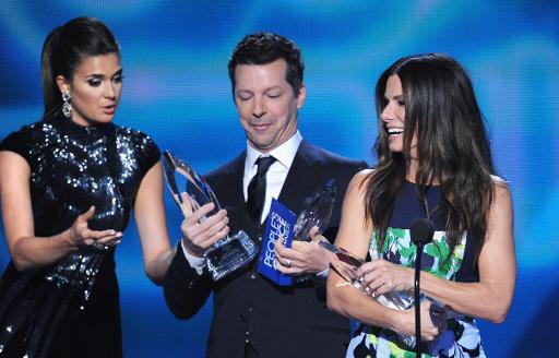 ©afp.com / Kevin Winter - A atriz Sandra Bullock (d) recebe o prêmio de melhor atriz no 40º People's Choice Awards, em Los Angeles, no estado americano da Califórnia, em 8 de janeiro de 2014