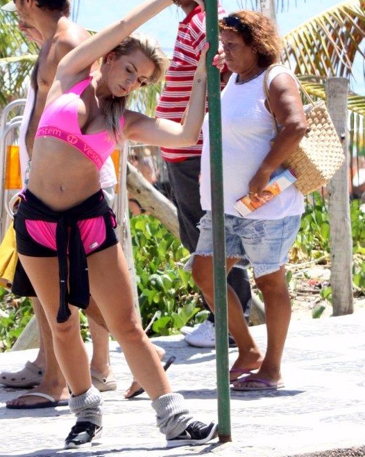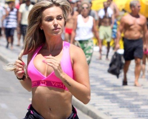 Ela foi clicada enquanto corria na Orla da Praia de Ipanema, na Zona Sul do Rio de Janeiro, usando um top pink decotado e barriguinha de fora.