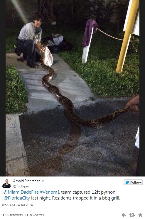 Uma píton birmanesa de 3,6 metros de comprimento foi encontrada por moradores de Florida City nos Estados Unidos, o animal estava passeando pelo bairro e os moradores decidiram organizar uma equipe para capturar a cobra. Após concluirem com sucesso o objetivo prederam o réptil na churrasqueira de uma residencia na área, à espera de socorro.