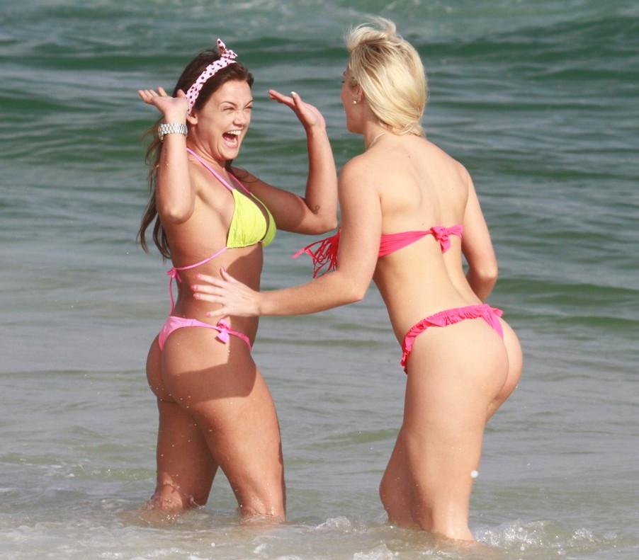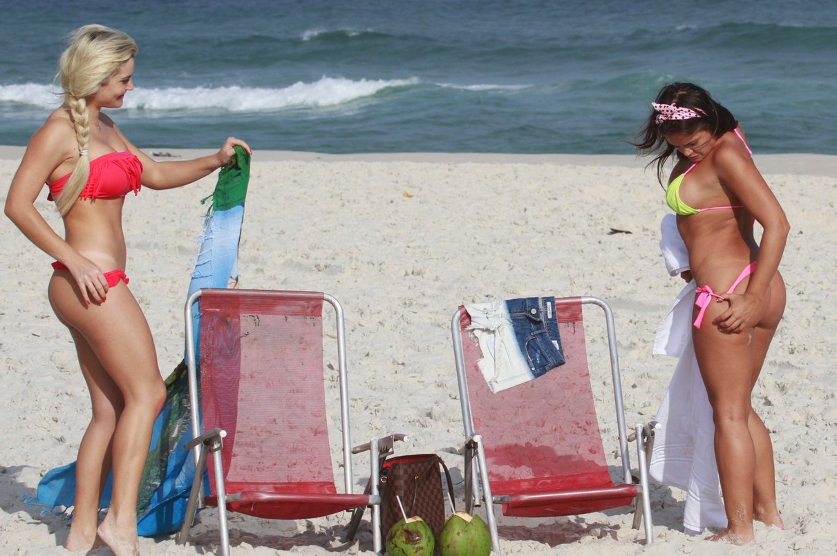 A 'coelhinha da Playboy' Thaiz Schmitt foi à praia da Barra da Tijuca, no Rio de Janeiro, em ótima companhia. A loira levou a amiga Caren Souza, do programa adulto 'Caravana' (Multishow), e as duas aproveitaram para se exibir para o paparazzo de plantão.