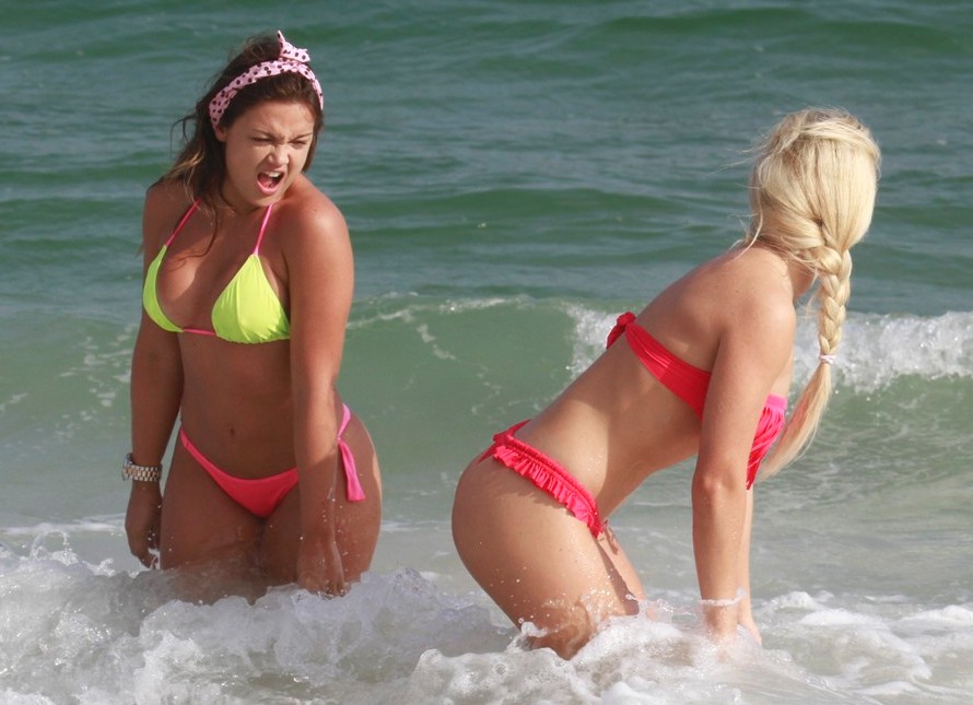 As duas se divertiram no mar e quando foram pegar um bronzeado nas areias, desamarraram o biquíni, deixando parte dos seios à mostra.