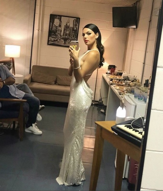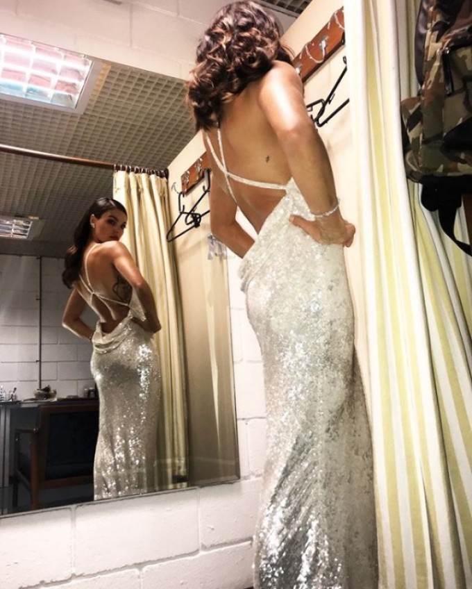 Isis Valverde escolheu um vestido branco com muito brilho para o especial Roberto Carlos gravado nesta terça-feira (29) e publicou algumas fotos em que aparece deslumbrante.
