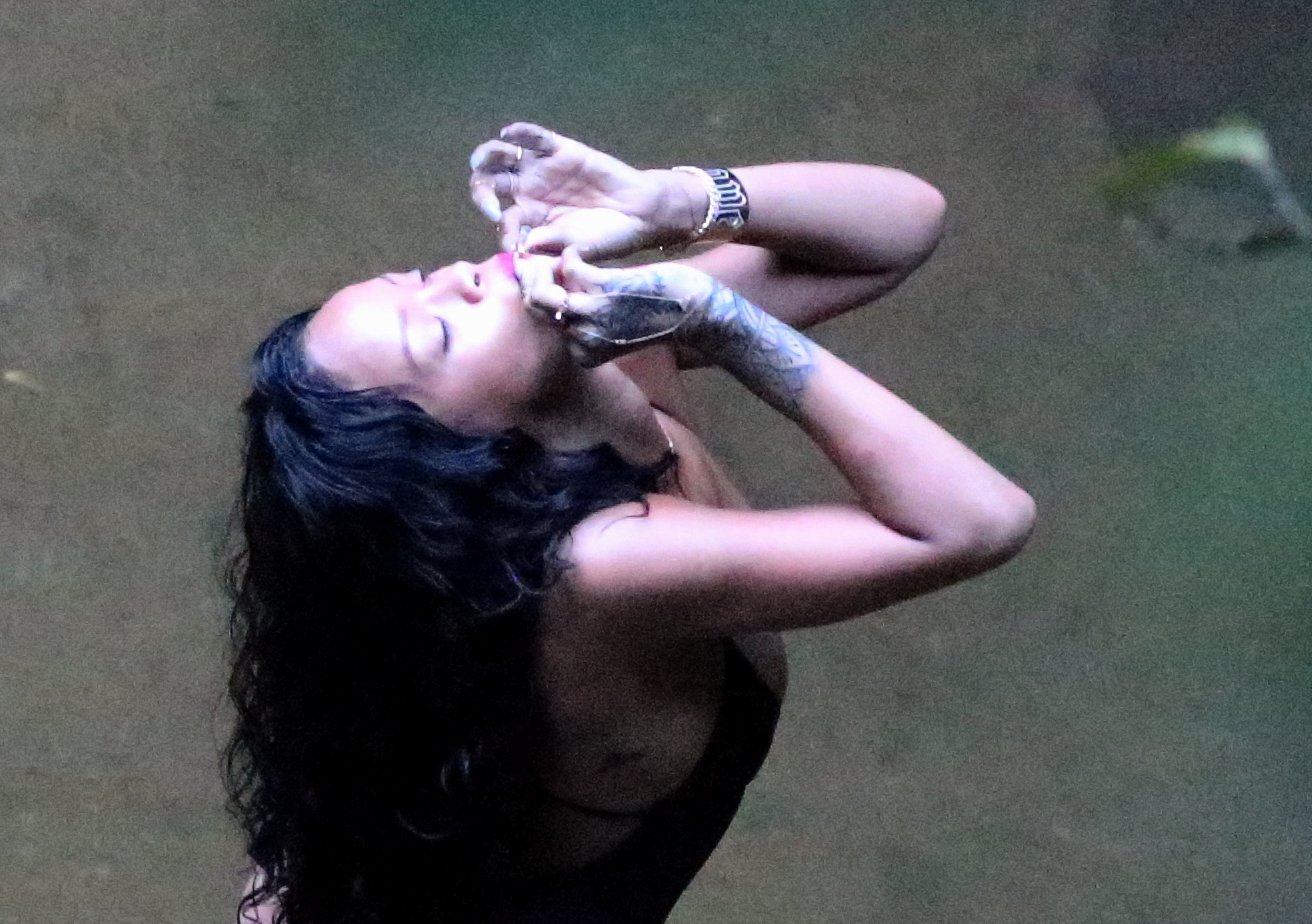 Rihanna está curtindo o Brasil do seu próprio jeito, e como não poderia ser diferente, ela foi flagrada fumando um "cigarrinho suspeito" durante um tempo que tirou de folga na Cachoeira do Bairro do Horto, na Zona Sul do Rio de Janeiro nesta quinta-feira (16). Na ocasião, ela usava um maiô fio-dental sexy, cabelos longos e batom cor-de-rosa.