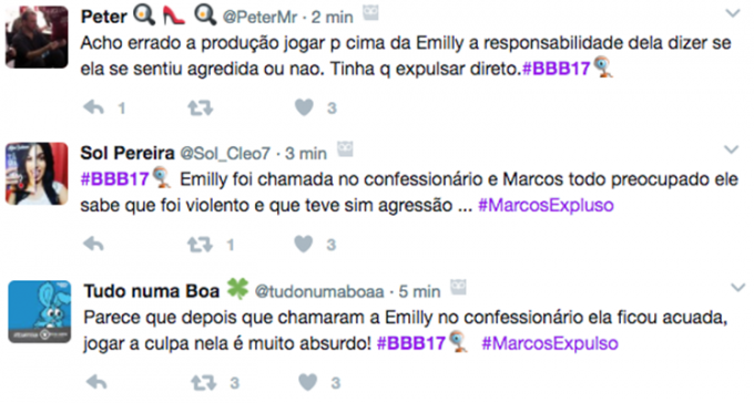 Os fãs da sister e de outros BBBs não gostaram nada do que viram e subiram a tag no twitter #MarcosExpulso pedindo que o cirurgião saísse do programa, comparando o episódio ao da ex-bbb Ana Paula Renault, que foi expulsa ao dar tapas na cara de Renan.
