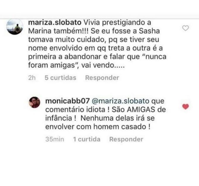 De acordo com o o perfil ‘Rainha Matos’, tudo aconteceu quando uma internauta fez um comentário maldoso dizendo para Sasha Meneghel tomar cuidado com Bruna Marquezine. “Vivia prestigiando a Marina também!! Se eu fosse a Sasha tomava muito cuidado porque se tiver seu nome envolvido em qualquer treta a outra é a primeira a abandonar e falar que ‘nunca foram amigas’. Vai vendo”, disse a internauta relembrando o unfollow de Marquezine em Marina na época em que a ruiva foi apontada como pivô de separação de José Loreto.