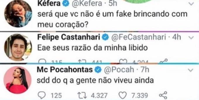 "Bom dia razão da minha libido", escreveu Whindersson Nunes via Twitter. "Será que vc não é um fake brincando com meu coração?", zoou Kéfera. "Saudades do que a gente não viveu ainda", tuitou MC Pocahontas. "Eae seus razão da minha libido", zoou Felipe Castanhari.