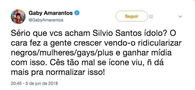 Gaby acusou o apresentador de ridicularizar negros, mulheres, gays e plus para ganhar mídia. “Sério que vocês acham Silvio Santos ídolo? O cara fez a gente crescer vendo-o ridicularizar negros/mulheres/gays/plus e ganhar mídia com isso. Vocês tão mal de ícone viu, não dá mais pra normalizar isso”, escreveu.