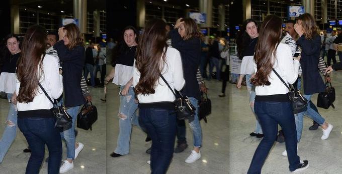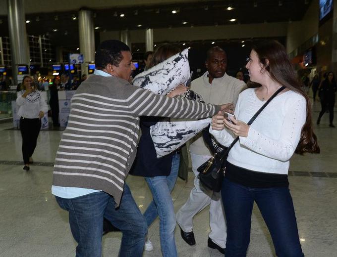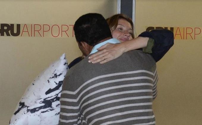As jovens saíram sem fotos - no máximo uma lembrança frustrada do travesseiro da loira e do funcionário as mandando ficar longe.  Quando chegou na área de embarque, a  über model deu um abraço em seu segurança brasileiro.