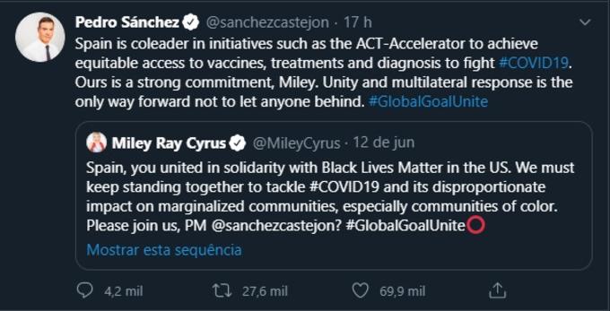 Após o apelo, Pedro Sanchez respondeu à artista no twitter e se comprometeu em unir forças em combate à doença. "Espanha está entre os líderes de iniciativas como o ACT-Accelerator para garantir um acesso equitativo a vacinas, tratamentos e meios de diagnóstico para combater a Covid-19. O nosso compromisso é forte, Miley. União e resposta multilateral é o único caminho para não deixar ninguém para trás".