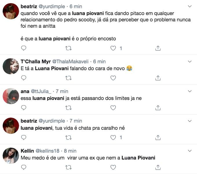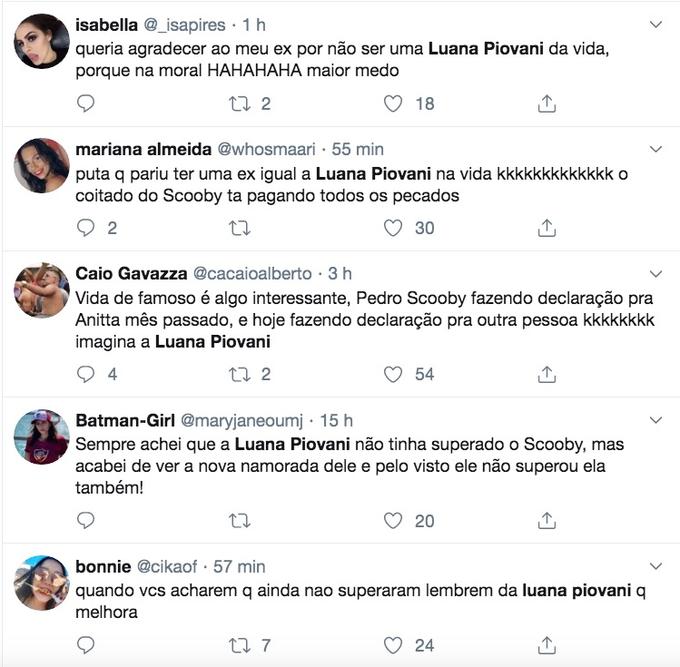 “Já dizia a rainha Marília Mendonça: Luana Piovani, supera!”, disse uma internauta. “Essa Luana Piovani só passa vergonha mdsss, todo relacionamento do ex ela da pitaco misericórdia kkkkkkk”, escreveu outro.