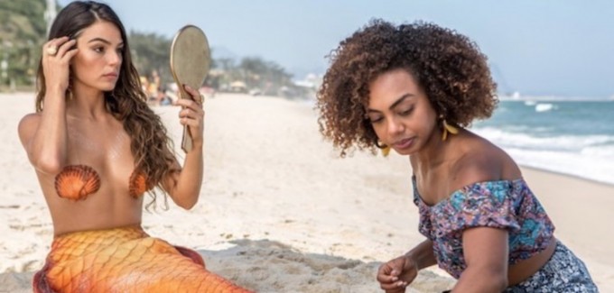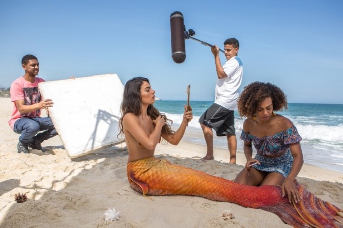 A sereia surgiu caracterizada, sem biquíni, apenas com a calda e conchas cobrindo parte dos seios.