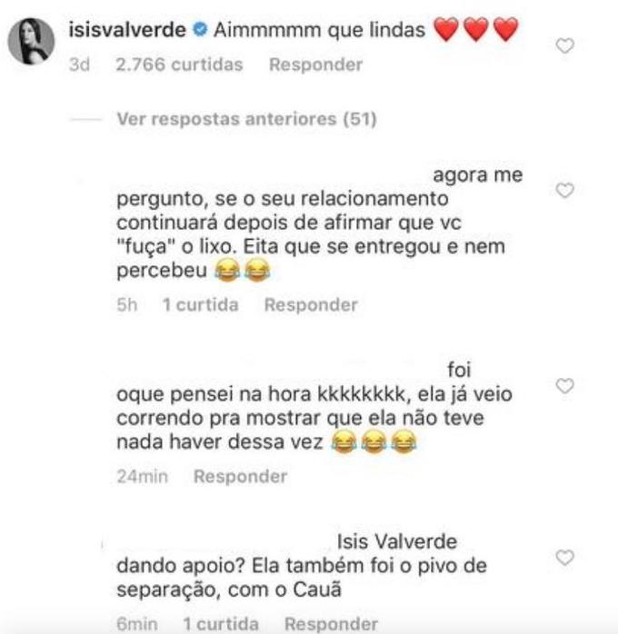 “Isis dando apoio? Ela também foi pivô de separação”, criticou uma seguidora. “Dessa vez não foi você né?”, insinuou outra pessoa.
