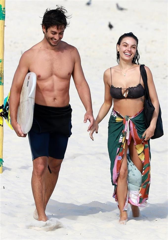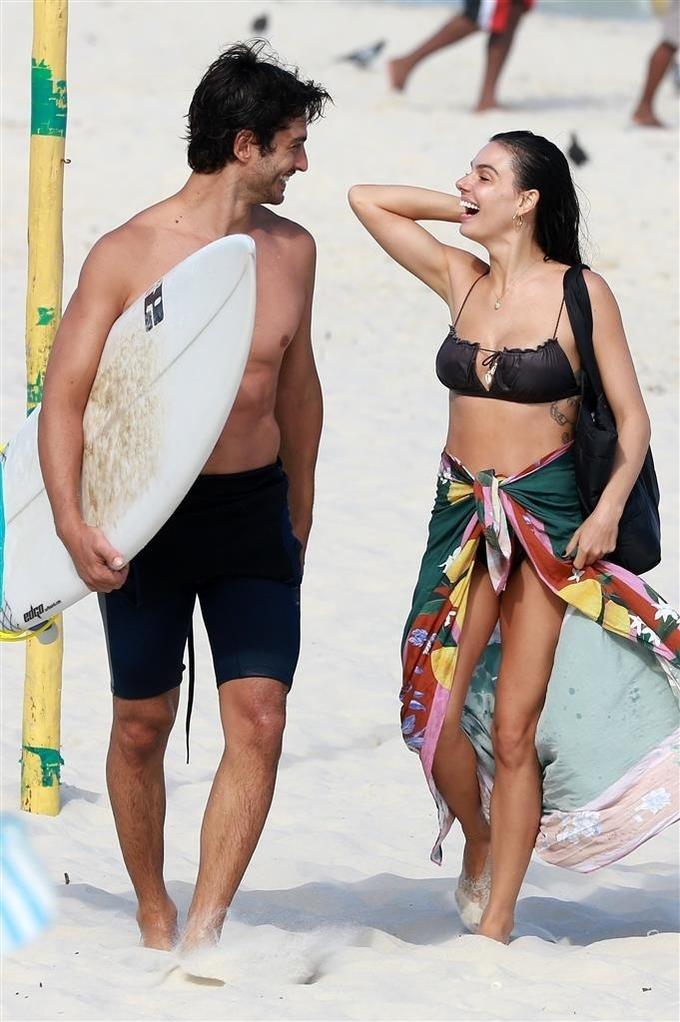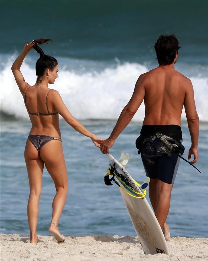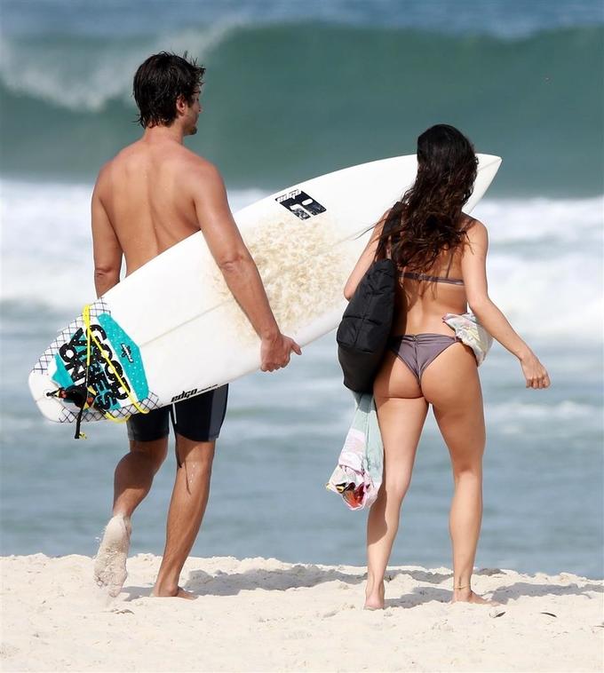 Isis trocou gargalhadas e carinhos com o modelo e empresário, que também aproveitou para surfar.