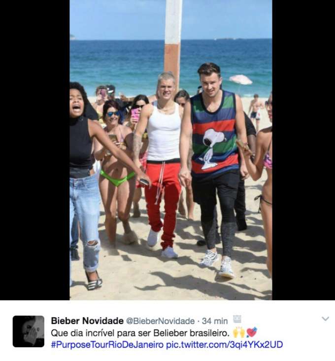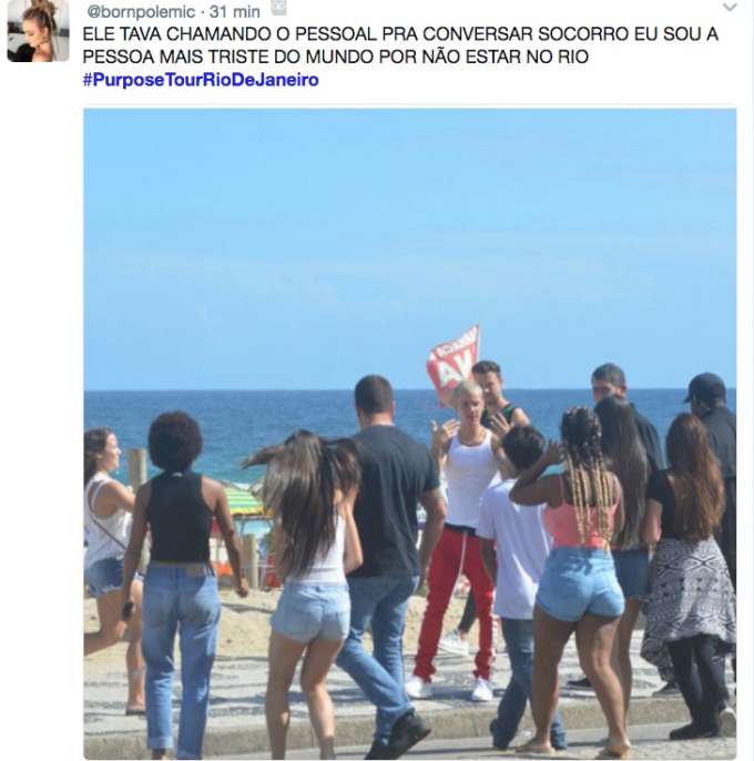Justin Bieber vai se apresentar logo mais na Praça da Apoteose, no Rio de Janeiro, com a turnê “Purpose”. Mas antes disso, o cantor resolveu sair do hotel e ir à praia de Ipanema.