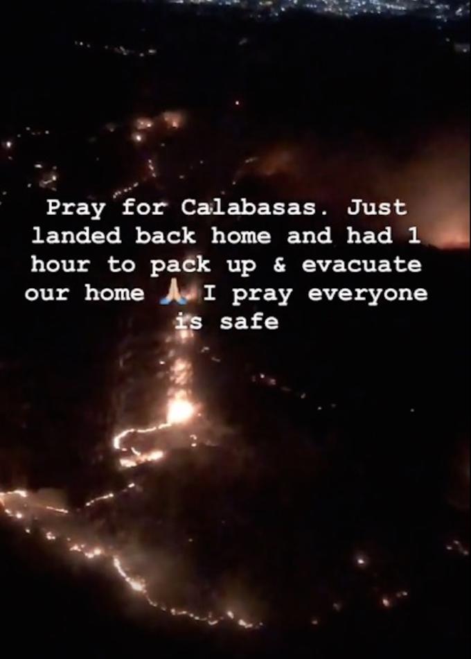 A socialite precisou evacuar sua residência com os três filhos. Depois mostrou uma foto do incêndio da janela de um avião. “Acabei de voltar para casa e tive uma hora para pegar as coisas e evacuar nossa casa. Oro para que todos estejam em segurança”, escreveu Kim.