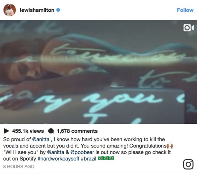 O piloto de Fórmula 1, Lewis Hamilton, não só gostou do novo clipe de Anitta, “Will I see You”, como também usou as redes sociais para babar pela artista.