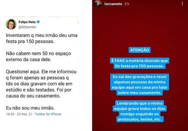 Além de lembrar que ele e o irmão são pessoas diferentes, Felipe disse que procurou Luccas para entender a história e o mesmo a desmentiu, informando que reuniu apenas as pessoas com quem trabalha diariamente em sua casa. Em seguida, Luccas se pronunciou, desmentindo a notícia.