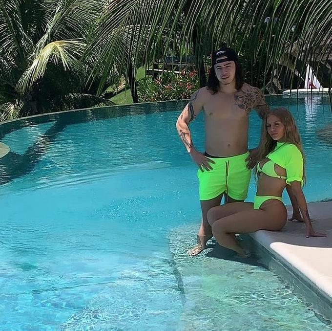 A cantora exibiu o bumbum empinado ao lado do youtuber, que exibiu a barriga definida.