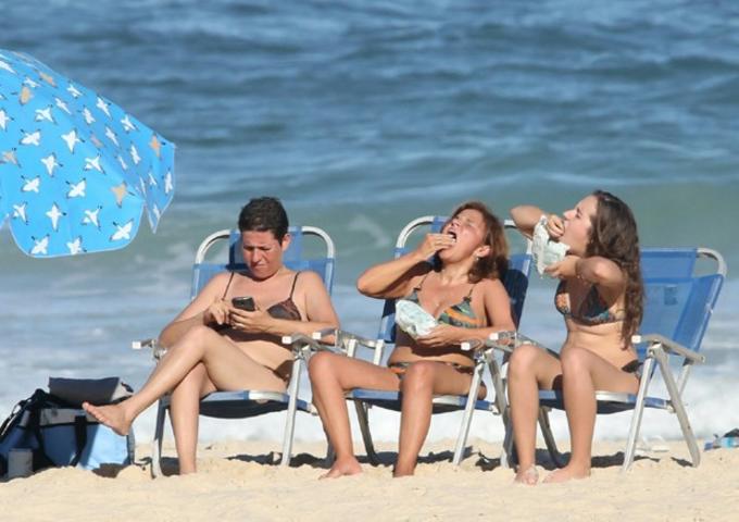 Claudia Rodrigues aproveitou a tarde desta quinta-feira (10) para pegar um bronze na praia de Ipanema com a filha e a empresária. A atriz luta contra esclerose múltipla desde 2000, e no ano passado teve uma crise grave.