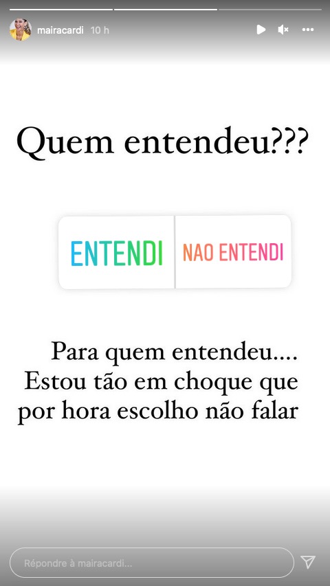 Maíra perguntou aos seguidores o que acharam da edição e colocou duas opções negativas para escolha, "péssimo" ou "descarado". Em seguida, a coach afirmou estar "em choque" e por isso escolheu não falar.