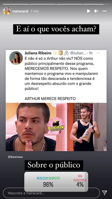 Na terceira publicação, ela compartilhou o tweet de uma fã que disse: "Merecemos respeito! Manipular de forma tão descarada e tendenciosa é um desrespeito absurdo com o grande público", comentou a internauta citada por Maíra.